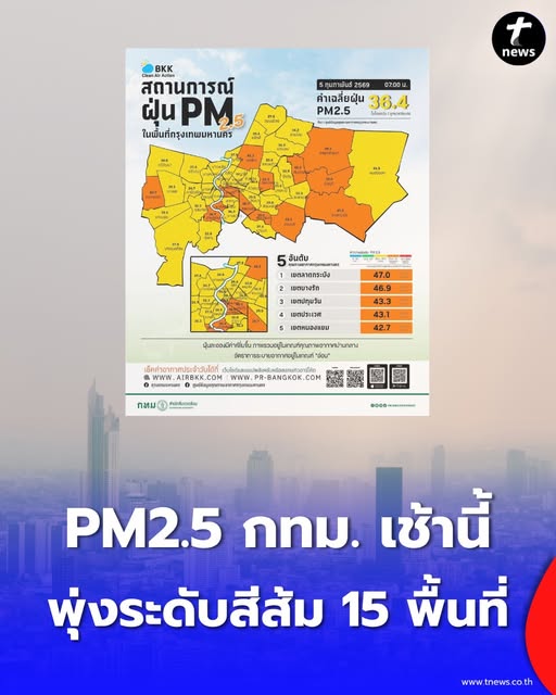 "รายงานฝุ่น PM2.5 กทม. เช้านี้พุ่งระดับสีส้ม 15 พื้นที่"